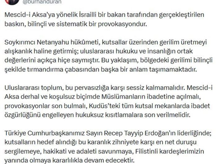 Eğitim İletişim Başkanı Duran: Mescid-i Aksa’ya yönelik baskın, bilinçli ve sistematik bir provokasyondur İLETİŞİM Başkanı Burhanettin Duran,...