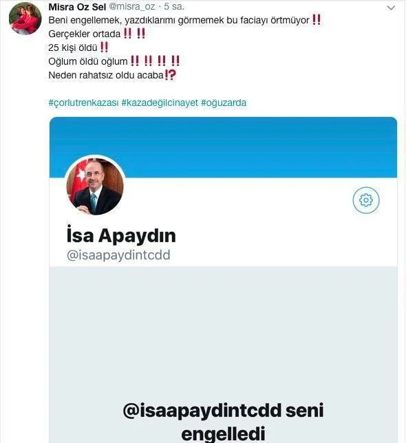 2015’te genel seçimlerde AKP’den Ankara 1. Bölge Milletvekili Adayı olan İsa Apaydın, Torlu Tren Katliamı’nda hayatını kaybeden Oğuz Arda Sel’in annesi Mısra Öz’ü sosyal medya hesabından engellemişti.