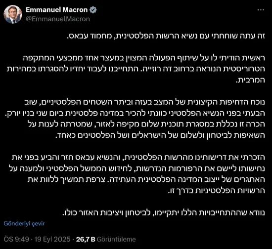 Gazze’de ve genel olarak Filistin topraklarında yaşanan son derece acil durum nedeniyle, Başkan Abbas’a Pazartesi günü New York’ta Filistin Devleti’ni tanıma niyetimi bir kez daha ifade ettim.